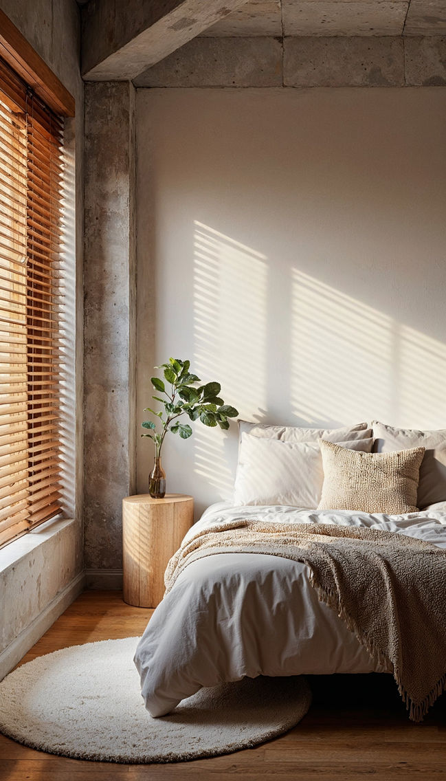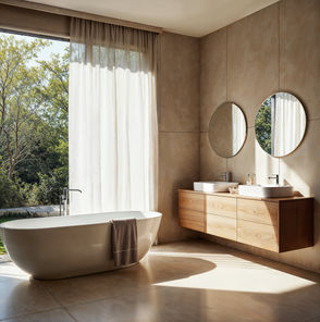 Ein modernes Badezimmer mit einer eleganten, freistehenden weißen Badewanne, die prominent auf hellen Steinfliesen platziert ist. Natürliches Licht durchflutet den Raum durch große Fenster und erhellt das minimalistische Dekor. Wände und Schränke sind aus warm getöntem Holz gefertigt und bilden einen Kontrast zu den glatten Oberflächen von Wanne und Waschbecken. Zwei runde Spiegel reflektieren das sanfte Sonnenlicht und verstärken die luftige Atmosphäre. Ein weiches, graues Handtuch über der Wanne sorgt für Behaglichkeit. Die Komposition betont klare Linien und eine ruhige Atmosphäre, ideal zum Entspannen.